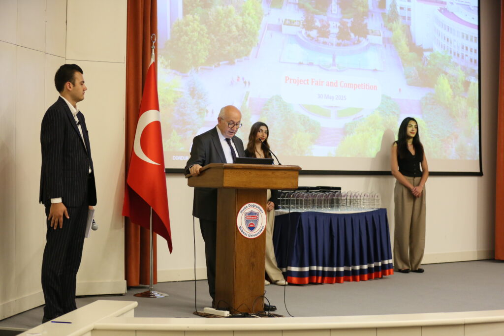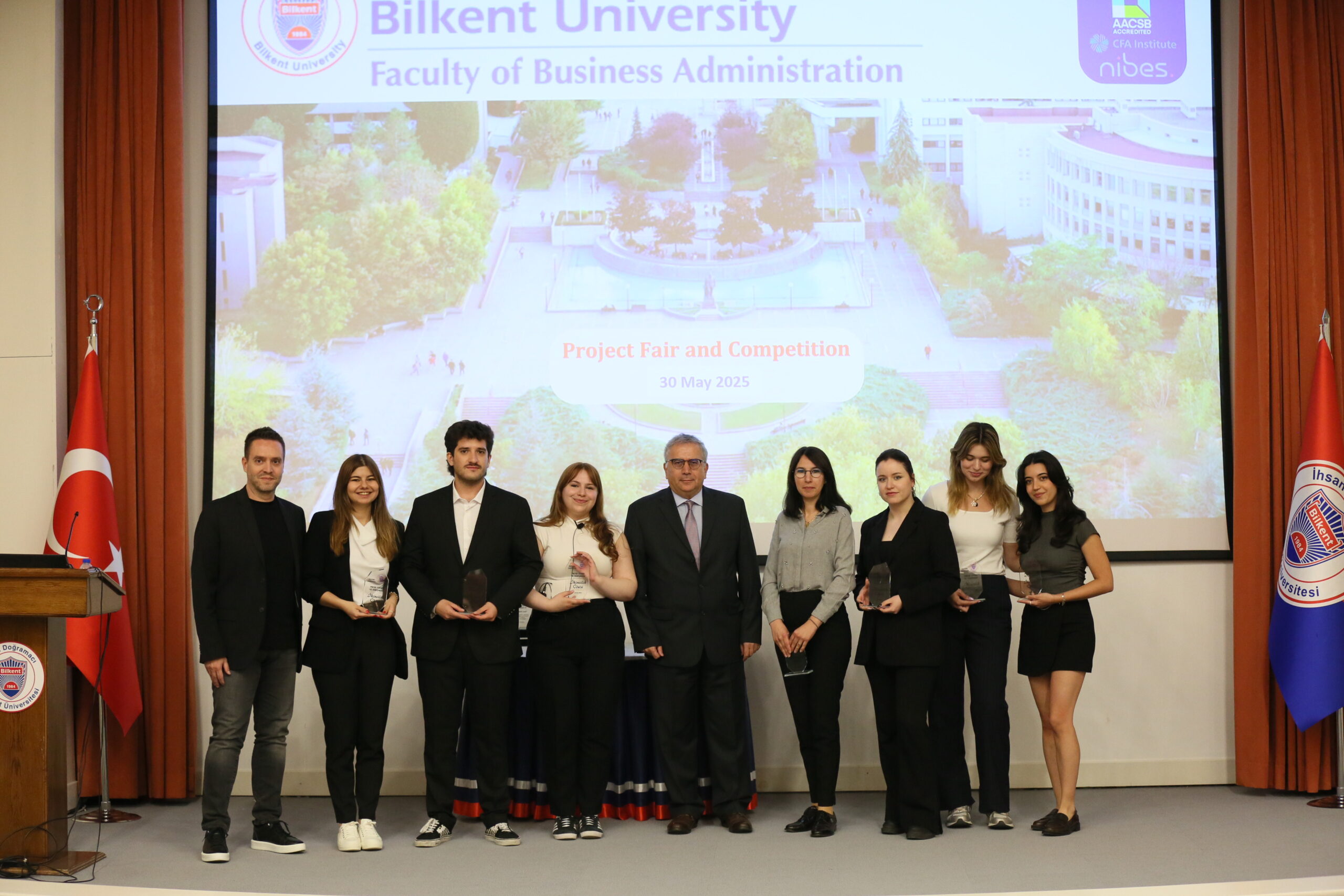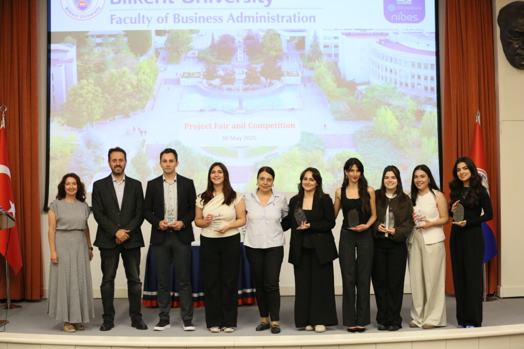 The Faculty of Business Administration at Bilkent University successfully held its Fourth Project Fair and Competition on May 30, 2025, at the Mithat Coruh Auditorium. The event served as a platform for 105 senior students—organized into seventeen teams—to present their research findings and innovative solutions to real-world business problems, developed in collaboration with sixteen prominent companies.