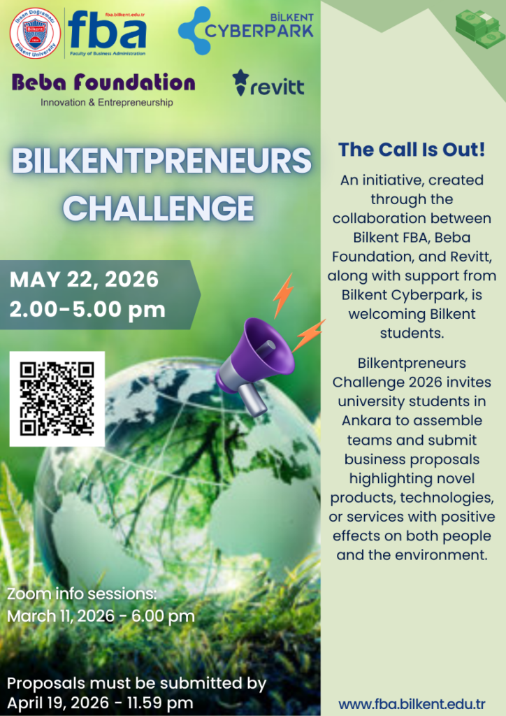 We are excited to announce that Bilkentpreneurs Challenge 2026, a startup pitch competition organized in collaboration with Bilkent University Faculty of Business Administration, the Beba Foundation, and Revitt with support from Bilkent Cyberpark, is now open to all students enrolled in universities located in Ankara!