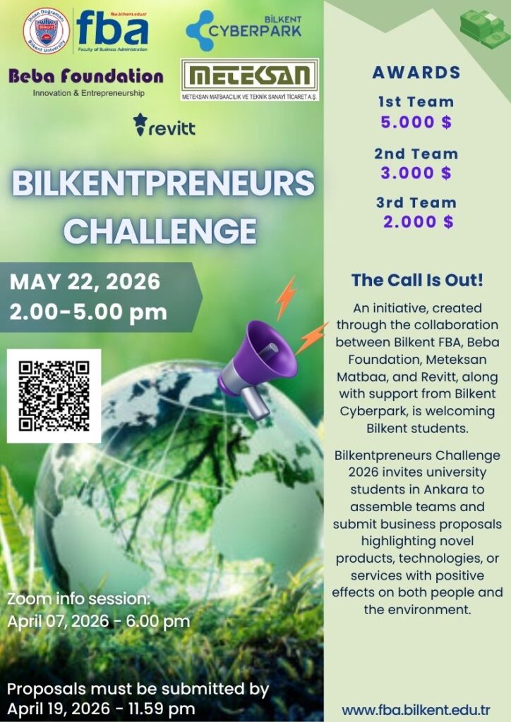 We are excited to announce that Bilkentpreneurs Challenge 2026, a startup pitch competition organized in collaboration with Bilkent University Faculty of Business Administration, the Beba Foundation, Meteksan Matbaa and Revitt with support from Bilkent Cyberpark, is now open to all students enrolled in universities located in Ankara!