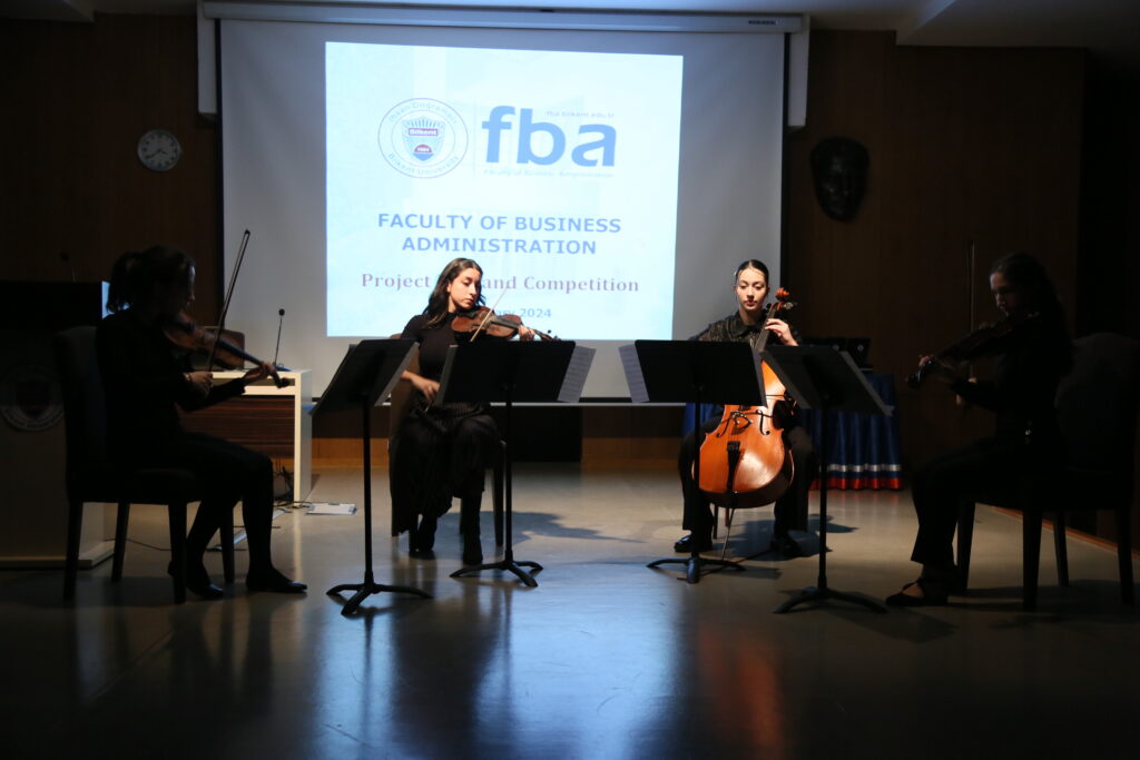 Within the context of the Business Capstone Project course that is taught by Ceren Aydoğmuş and Rasim Serdar Kurdoğlu the Project Fair and Competition of FBA was held on January 9 2024 at C Block Amphi with the participation of the student project groups, collaborated firms, academics, and the University administration. Furthermore, a distinguished group of Bilkent Music and Performing Arts Faculty students performed a marvelous concert for the guests.